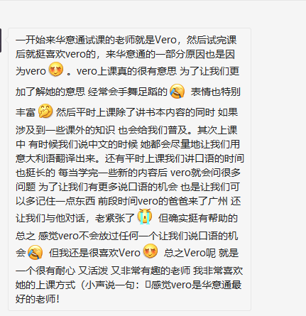 说起Veronica老师,那可谓是华意通的广州校区的灵魂人物了。她身上有非常多的闪光点:教书6年0差评、官方意大利语等级考试考官、拥有灵魂板书、大笑姑婆、学生本命。