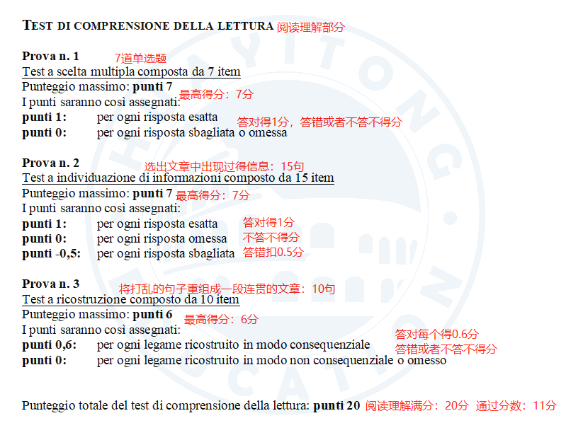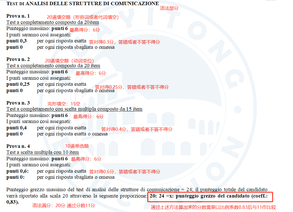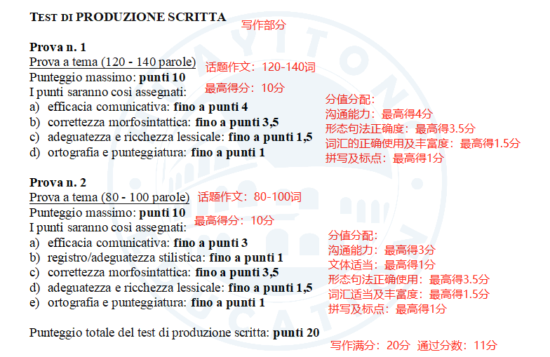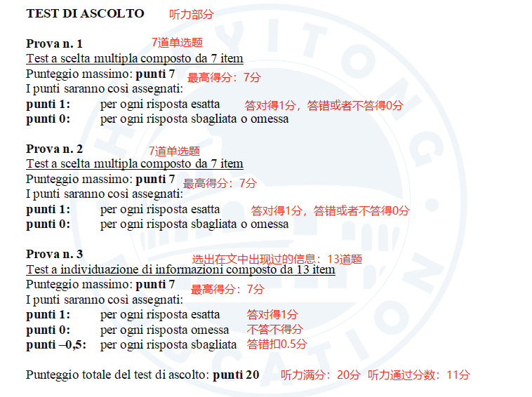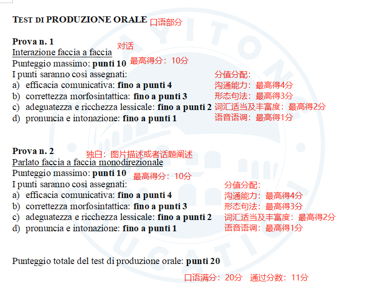 首先CILS A1-CILS C2 6个级别考试题目均涉及5部分内容:ascolto (听力),comprensione della lettura (阅读理解),analisi delle strutture di comunicazione (语法),produzione scritta (写作),produzione orale (口语)。A1、A2等级,各部分满分为12分,每部分最低通过分数为7分;B1-C2级别,各部分满分为20分,每部分最低通过分数为11分;如若该等级考试5部分内容未全部通过,已通过部分成绩保留18个月,18个月之内考生可以补考未通过得部分。