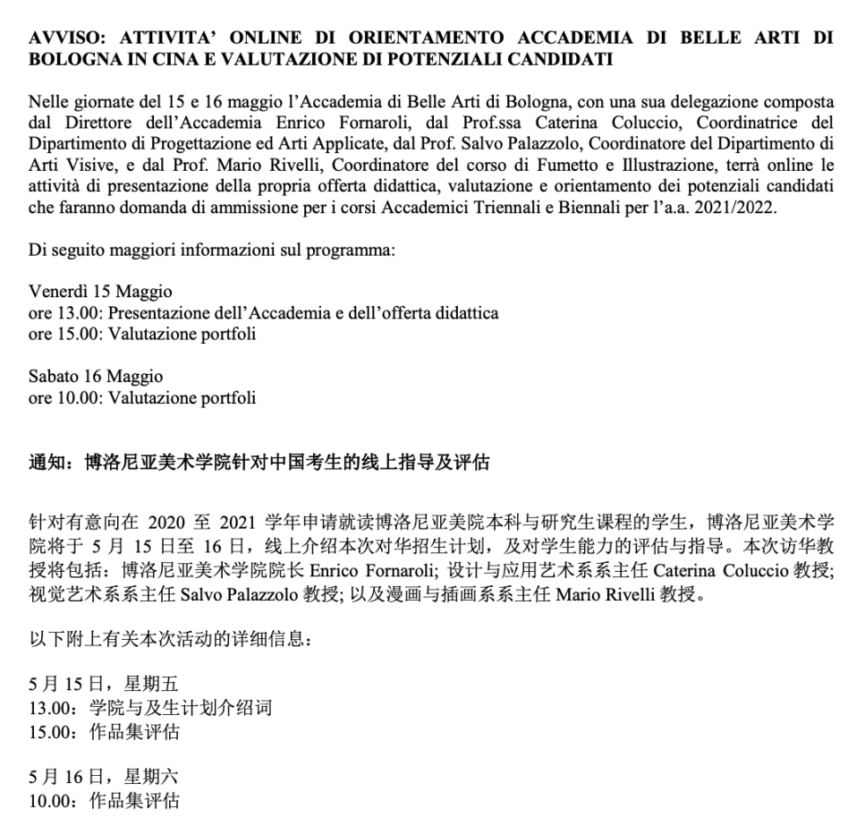 1、 本次线上预选评估是针对2021/2022学年有意向申请博洛尼亚美术学院的本科和研究生同学。(即今年的计划生和明年的国际生)