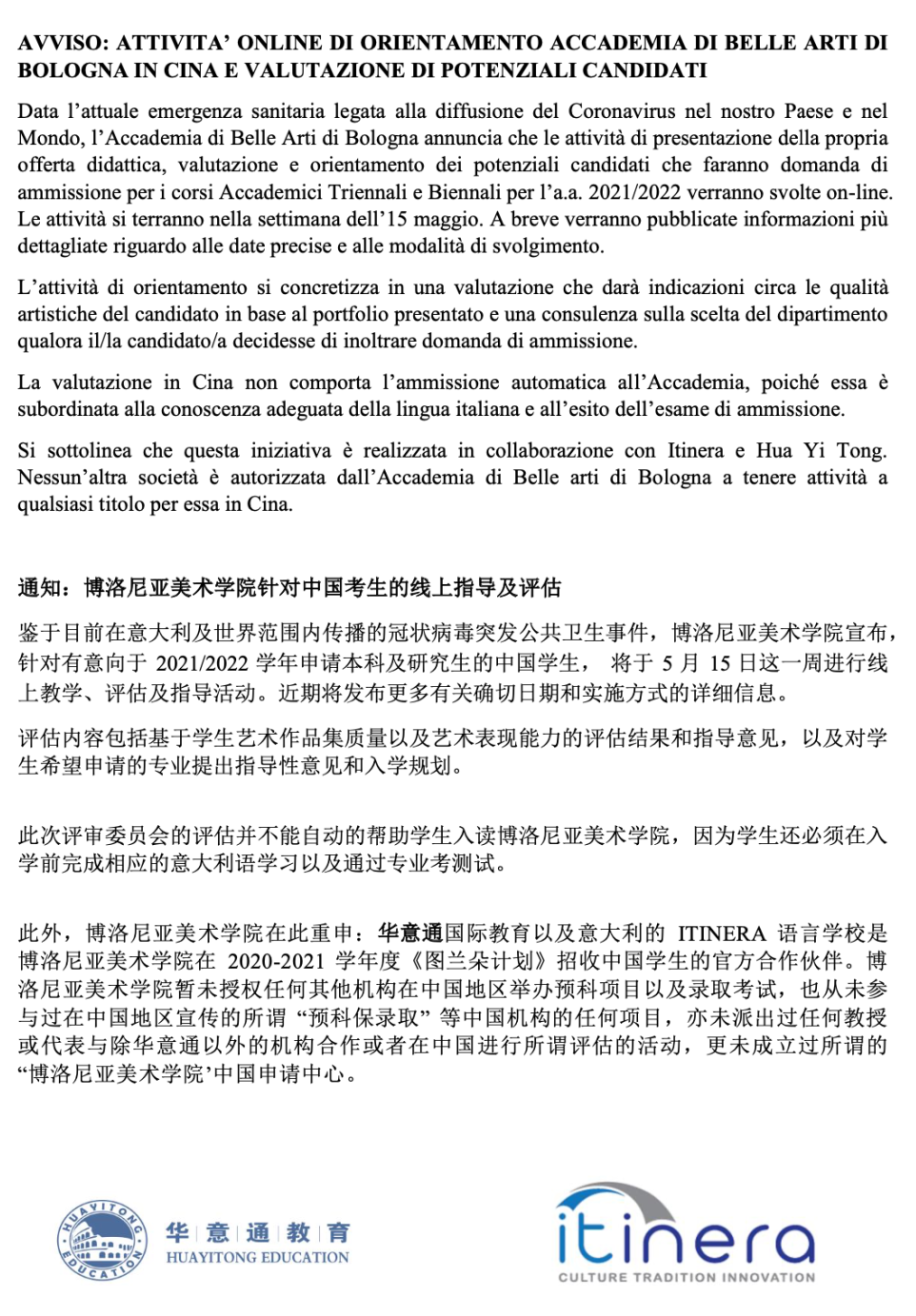 华意通也是博洛尼亚美术学院承认的唯一官方合作伙伴,我们不允许任何人以任何形式散布不实信息,一经发现,华意通与博洛尼亚美术学院方面均会对对方行为追究法律责任。