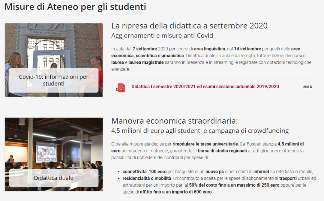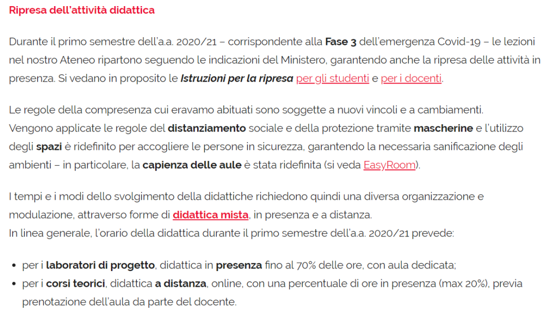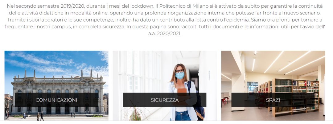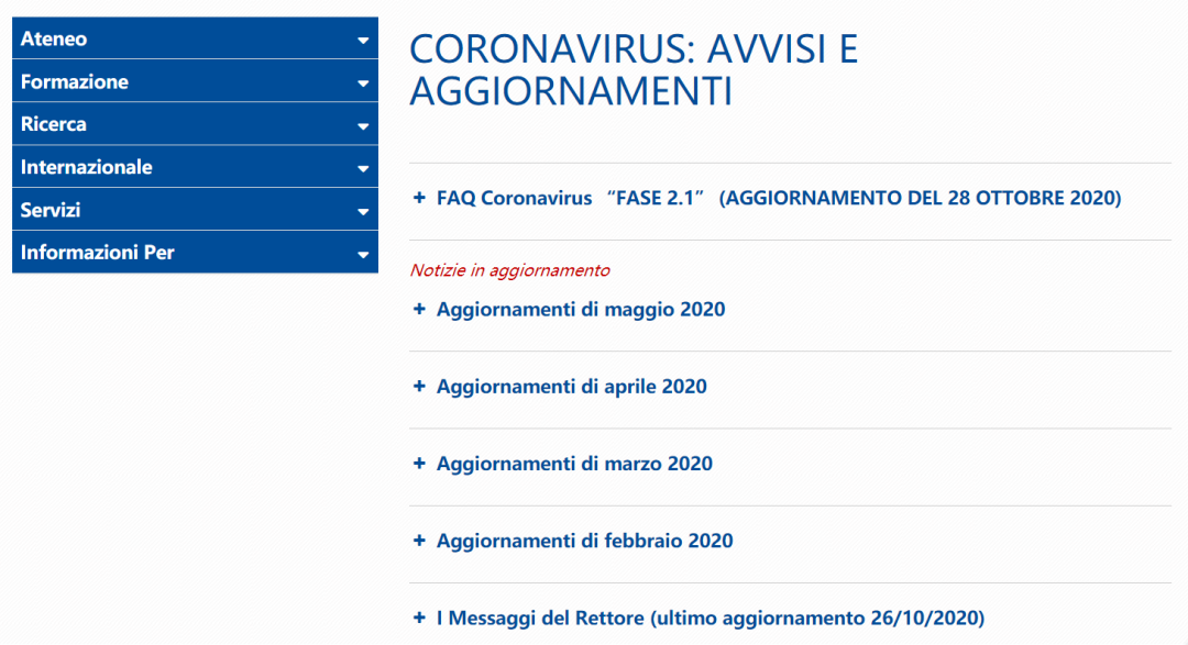为了防控疫情,意大利各大学都公布了各自的最新防疫政策与措施,在各大学的官网上都可以找到与疫情相关的页面。其中包括进出校园的规定、目前的教学形式、图书馆等公共资源的使用规则、学校对学生的帮助与支持等等。