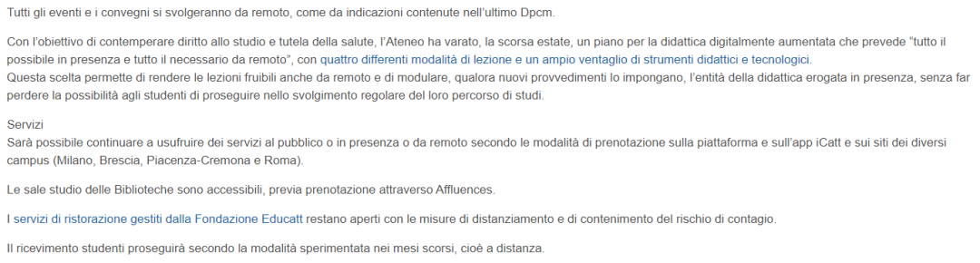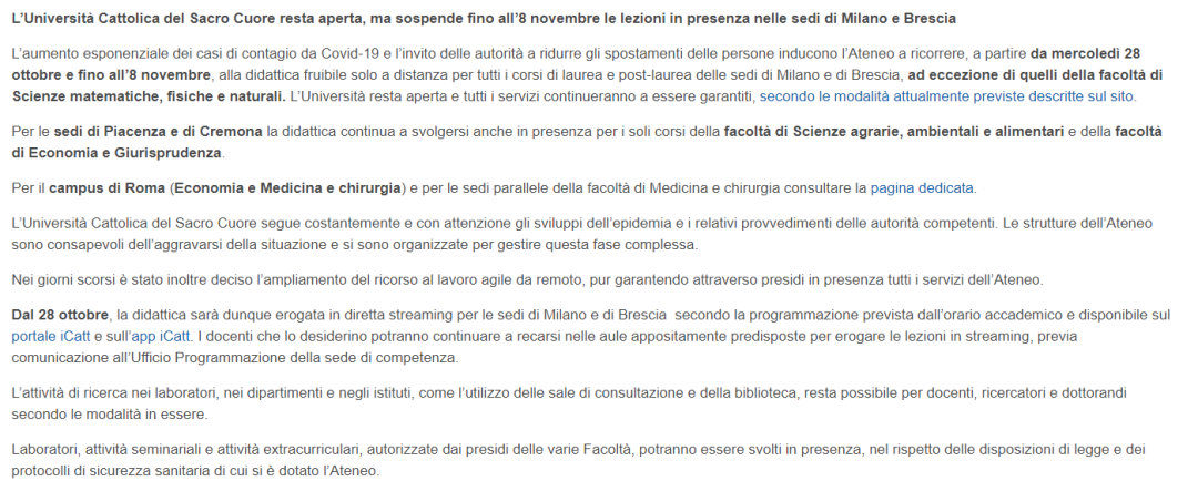大意就是,米兰圣心天主教大学将仍然保持开放,但米兰和布雷西亚校区将暂停一切线下演讲,直至11月8日。米兰和布雷西亚校区除数学,物理和自然科学学院以外的其他课程全部以线上形式开展。皮亚琴察和克雷莫纳校区的教学正常开展。