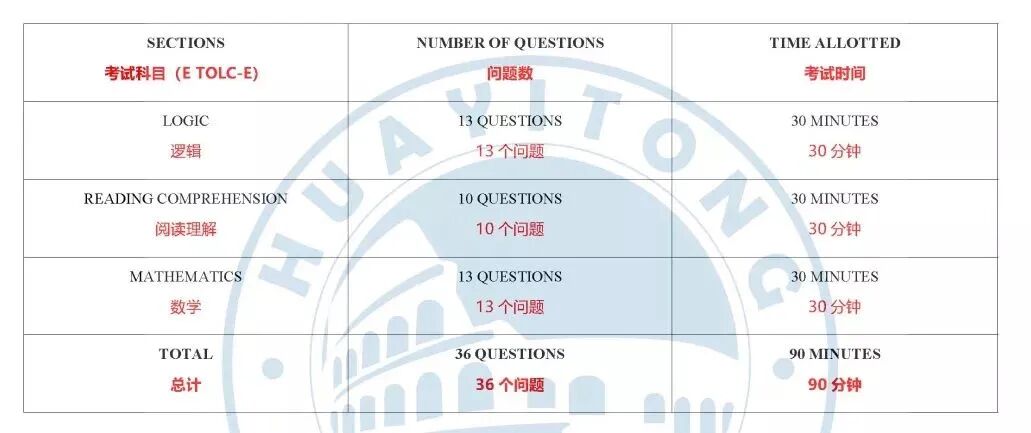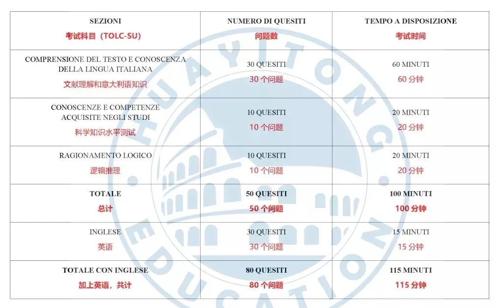 组成:由四个部分组成,分别是:数学,逻辑,科学,语言理解评分规则:答对得1分;不答不得分(不答0分);打错扣0.25分组成:由三个部分组成,分别是:数学,逻辑,语言理解评分规则:答对得1分;不答不得分(不答0分);打错扣0.25分组成:由五个部分组成,分别是:生物,化学,数学、物理、逻辑评分规则:答对得1分;不答不得分(不答0分);打错扣0.25分组成:由四个部分组成,分别是:基础数学,推理,文献理解,基础科学评分规则:答对得1分;不答不得分(不答0分);打错扣0.25分组成:由三个部分组成,分别是:基础数学,生物,物理,化学评分规则:答对得1分;不答不得分(不答0分);打错扣0.25分组成:由三个部分组成,分别是:文献理解和意大利语知识,科学知识水平测试,逻辑推理评分规则:答对得1分;不答不得分(不答0分);打错扣0.25分