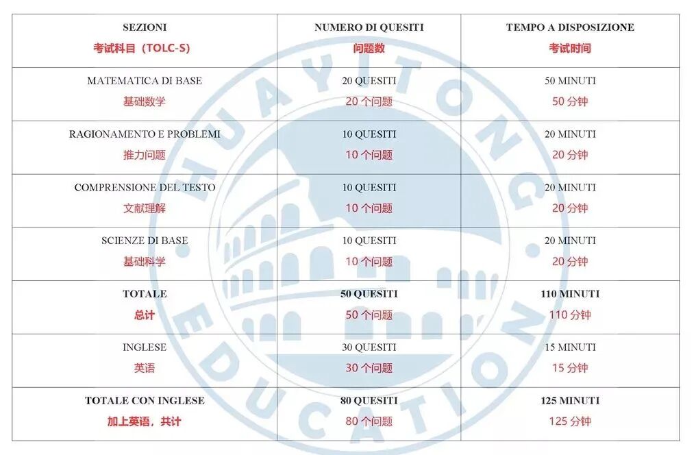 TOLC-F(Test Tolc-Farmacia,药学)TOLC-S(Test Tolc-Scienze,科学)TOLC-B(Test Tolc-Biologia,生物学)TOLC – SU(Test Tolc-Studi-Umanistici,人文学科)English TOLC-I(英语测试 - Test Tolc ingegneria,即英语 工程)English TOLC-E(英语测试 - Test Tolc Economia,即英语 经济)TEST DI ARCHITETTURA(建筑学,国家统考)TOLD(米兰理工大学室内设计、产品设计、传播设计、服装设计专业)