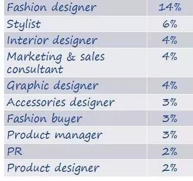 那什么专业最热门呢?排名前十的是:服装设计师、造型师、室内设计师、市场及销售顾问、平面设计师、配饰设计师、时尚买手、产品经理、公关以及产品设计师。服装设计14%,造型6%,Pauline公主学的就是造型。