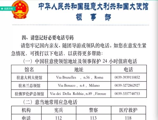 中国驻意大利大使馆的位置以及电话,意大利救急电话