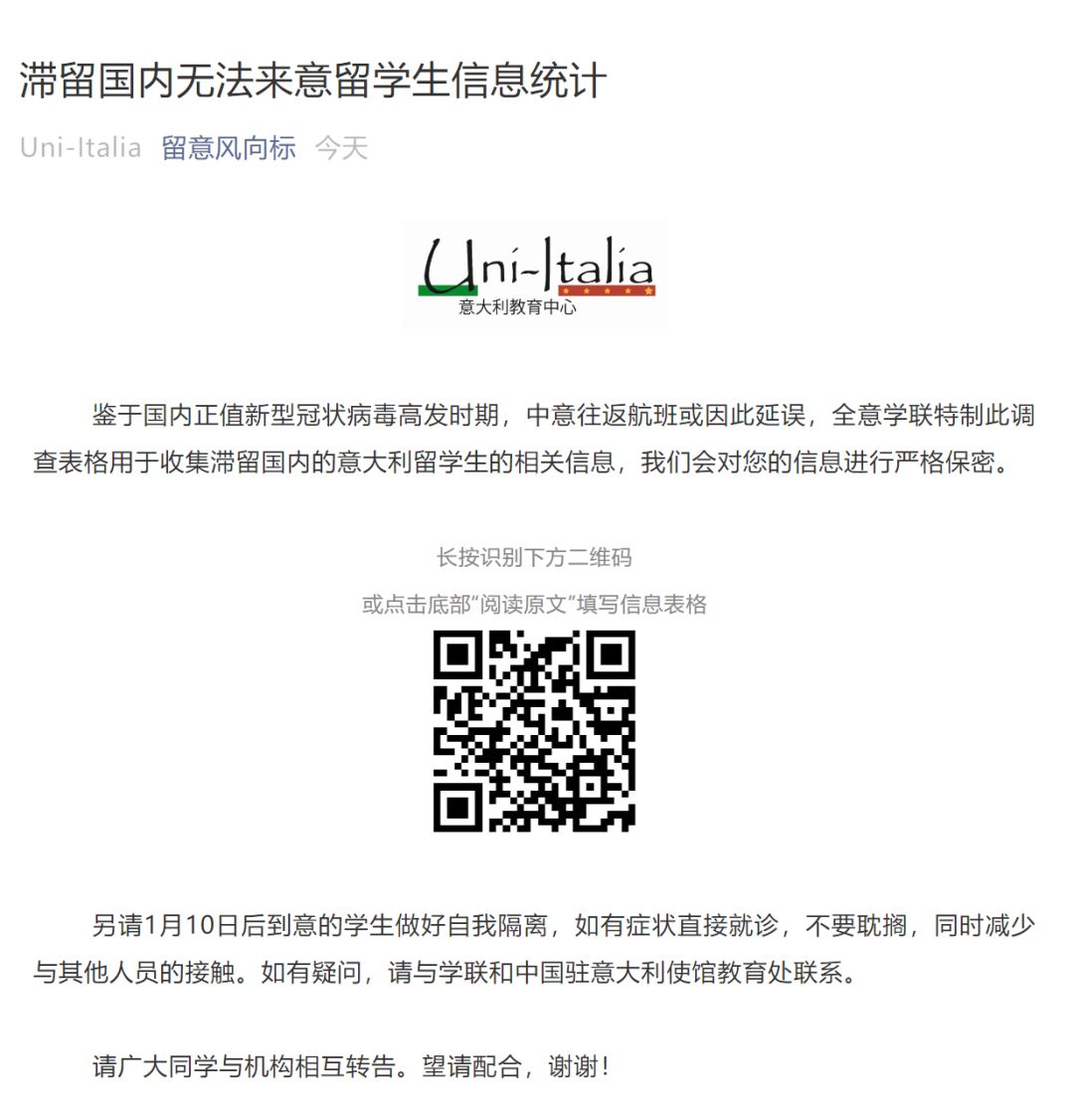 今天意大利教育中心对滞留在国内的学生进行了信息统计,这么多人不会不管的,后续应该有相关的政策。华意通的老师也会密切关注的!第一时间告诉你们。