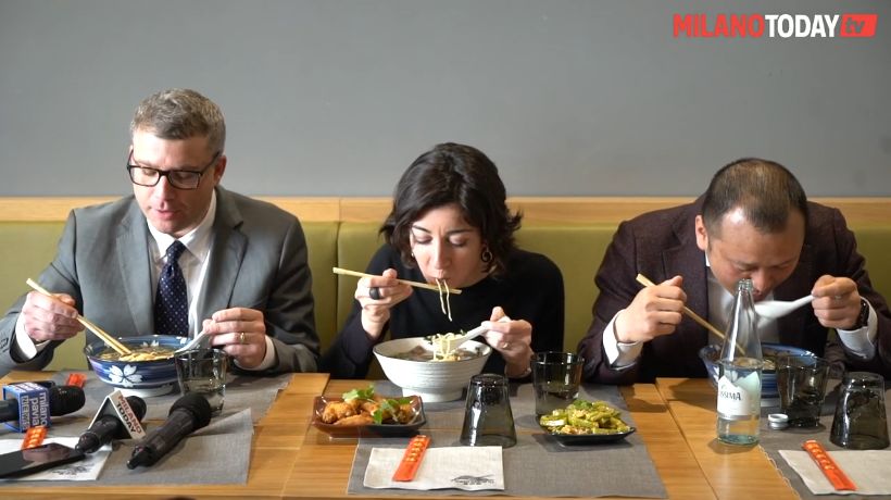 米兰市政府劳动局局长 Cristina Tajani,商业局局长兼工商联合会会长Marco Barbieri和华人社区代表Francesco Wu及各记者一起到华人街“Ramen a mano”餐厅一起共进午餐,以此证明新型冠状病毒通过中国餐馆的食物证明传染病的说法毫无根据。