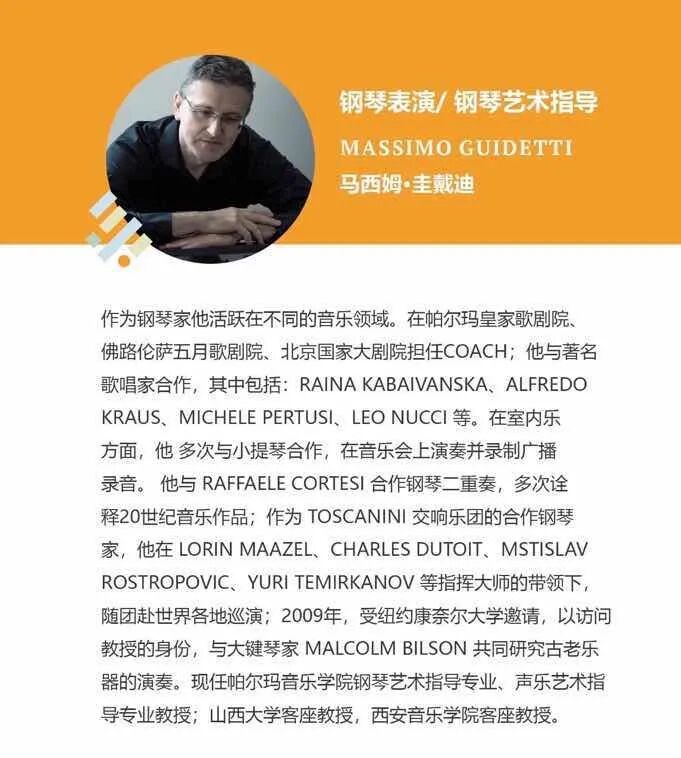 他是帕尔马音乐学院钢琴艺术指导专业终身教授,同时也是帕尔马音乐学院历年入学考试声乐专业、钢琴艺术指导专业评委。