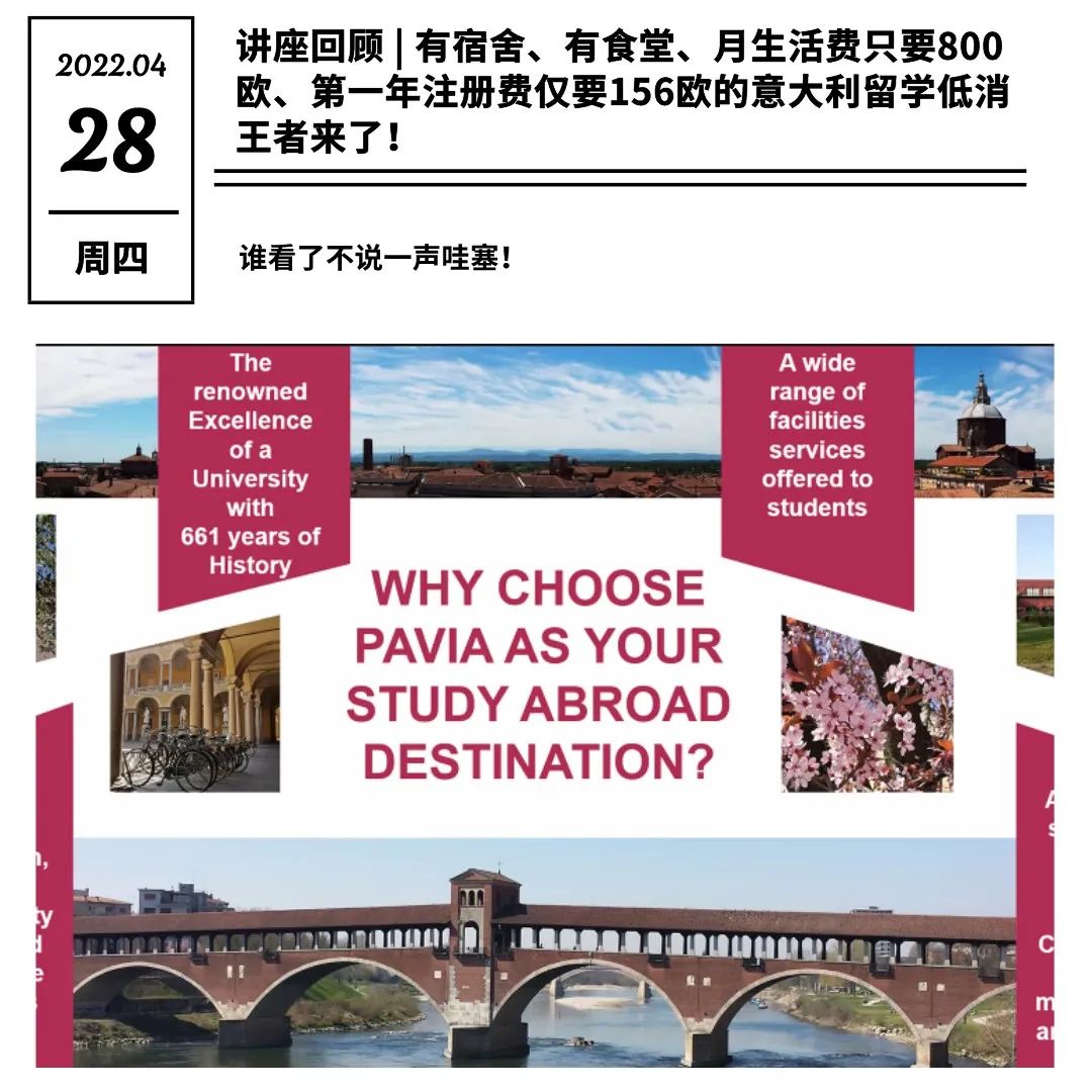 4月26日的4月26日的帕维亚大学讲座已经圆满结束,在本次讲座中,不仅帮助同学们对帕维亚大学有了更多的了解,同时还让同学们对帕维亚大学的语言班有了更加深入的了解。 低学费,有宿舍,有食堂,除了这些优势外,帕维亚大学和语言班还有哪些优势呢? 同学们跟着可仔一起来回顾一下吧!讲座已经圆满结束,在本次讲座中,不仅帮助同学们对帕维亚大学有了更多的了解,同时还让同学们对帕维亚大学的语言班有了更加深入的了解。 低学费,有宿舍,有食堂,除了这些优势外,帕维亚大学和语言班还有哪些优势呢? 同学们跟着可仔一起来回顾一下吧!
