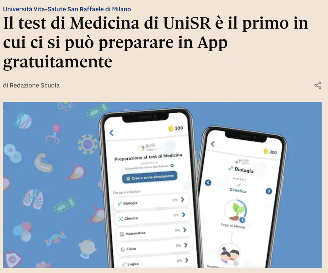 意大利第一的医学类大学UniSR医学测试是首个可以在app中免费准备的测试